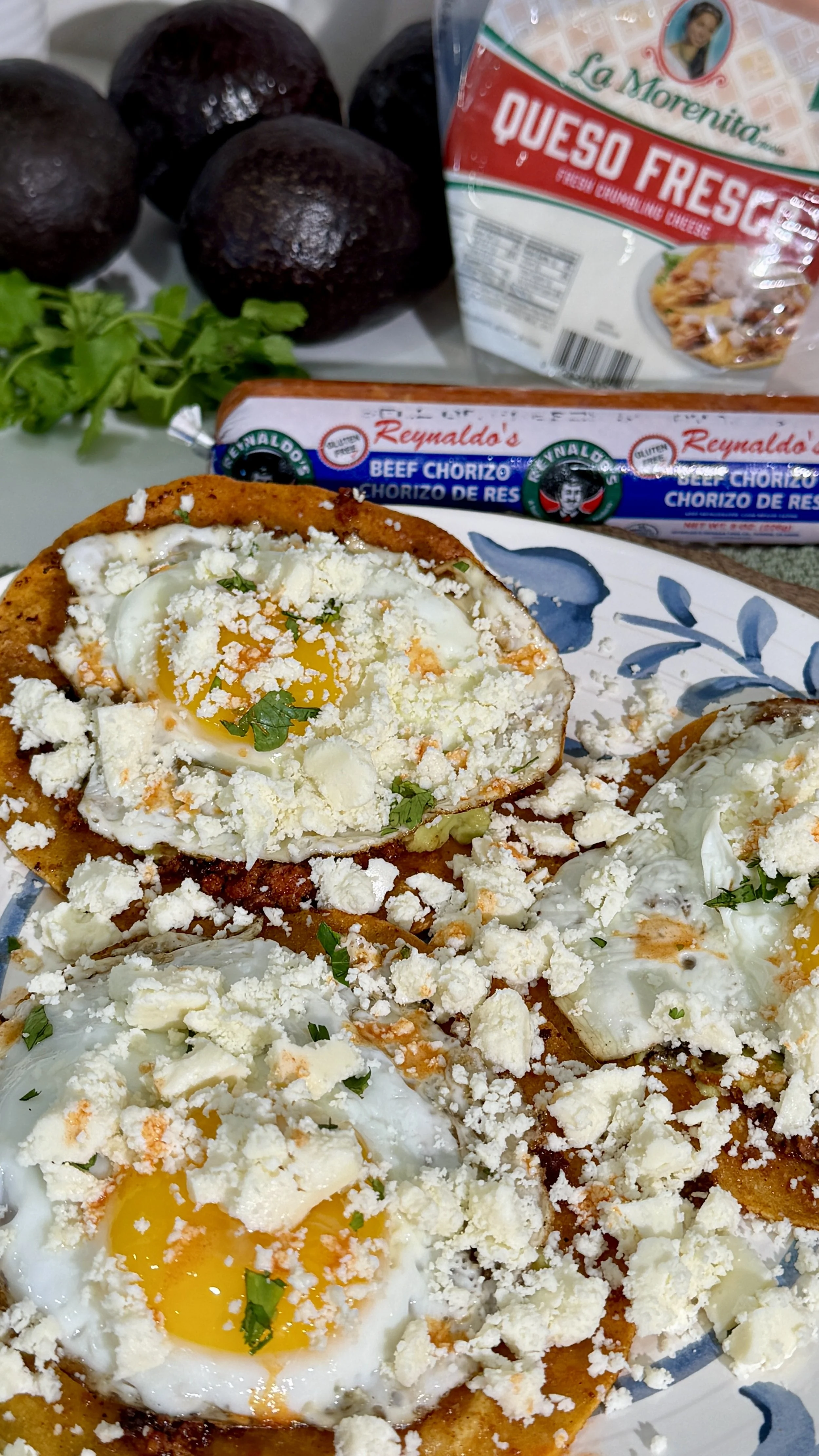 Assemble the tacos: start with the chorizo tortillas, then add the guacamole. Add the eggs, then garnish with the fresh cilantro and La Morenita’s queso fresco. Drizzle with hot sauce and enjoy.