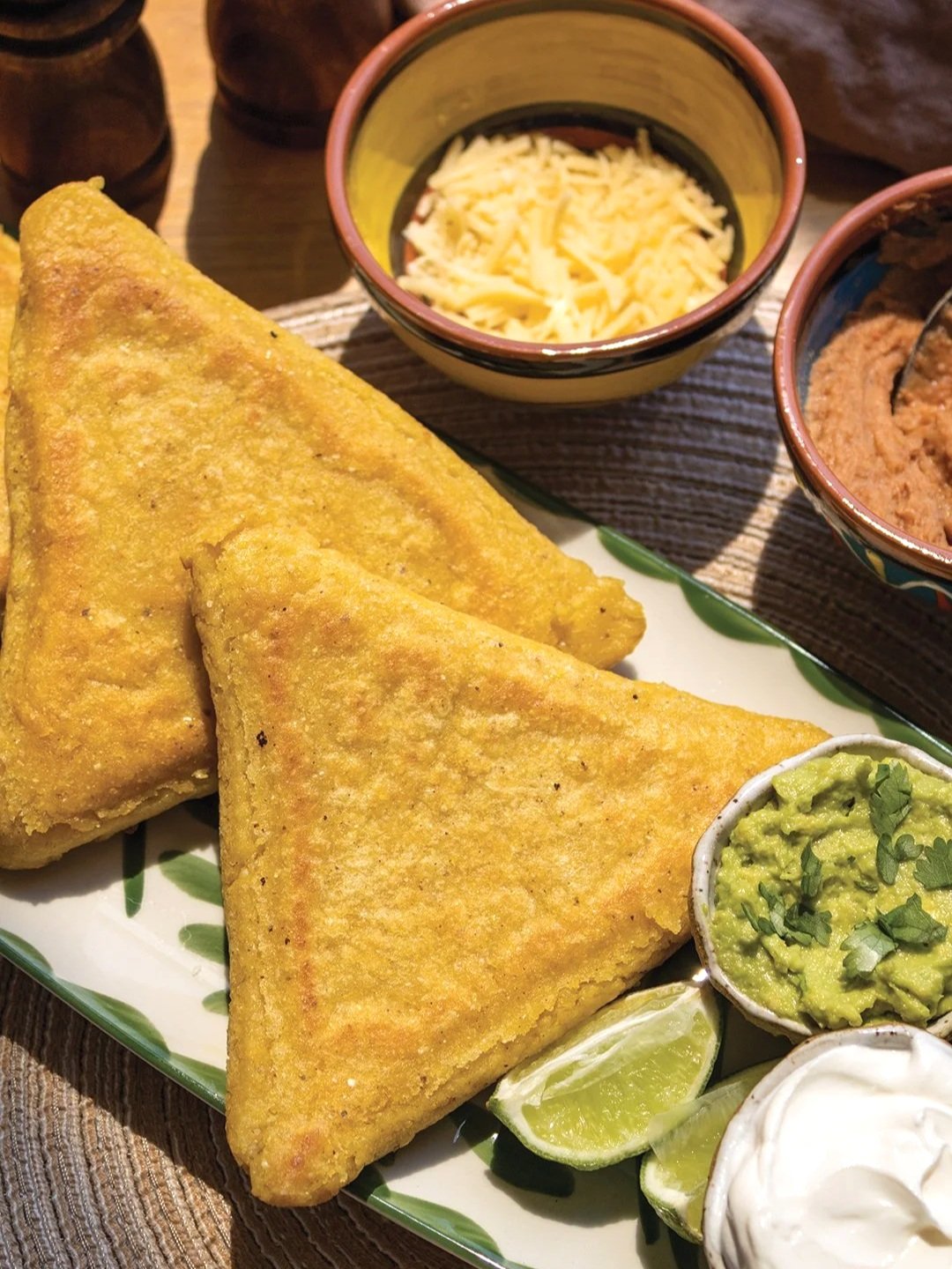 Fold over one side of the tortilla, then the second side, and finally flip over the third remaining side to close the tetela. It will look like a triangle. Repeat this process with the rest of the dough to make 3 tetelas. You can do this on cling wrap to make it easier.